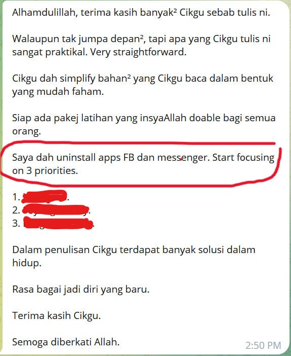 One of my students yang sudah go through 30-Day Declutter Journey & buat latihan dalam course tersebut, dah pun berjaya delete social media. Sebab dia dah tahu apa life priority dia: