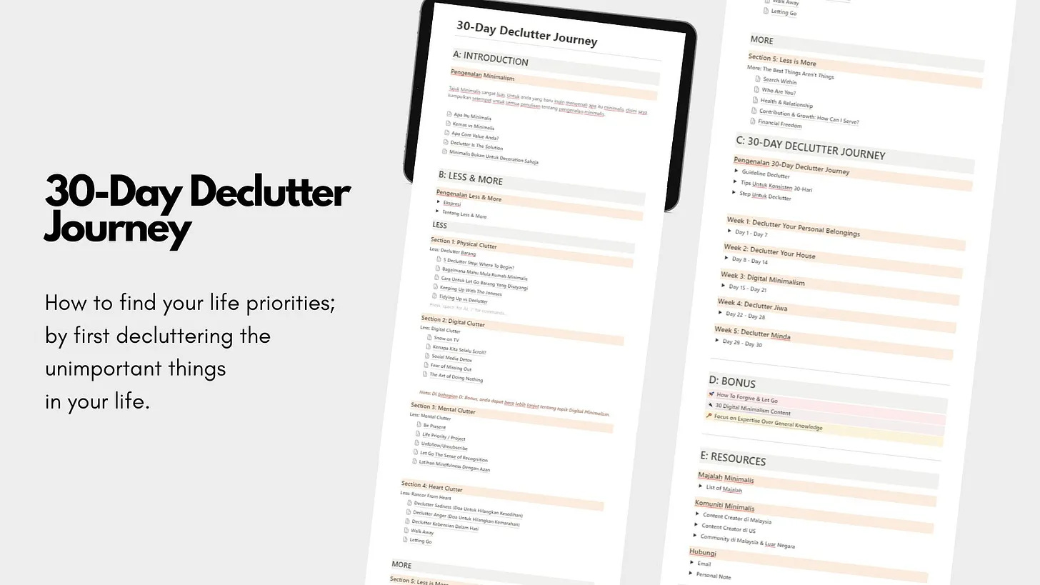 30-Day Declutter Journey: An online self-paced course untuk bantu anda find your life purpose, and start focusing on your life priorities.